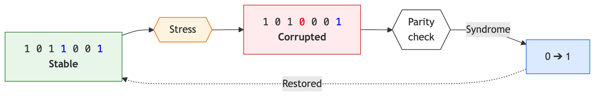 - Stress (Disturbance): External noise inverts one bit in the sequence. In the diagram, this is the transformation of a "one" into a red zero at position 4. The system transitions from a stable state to one containing an "information defect."