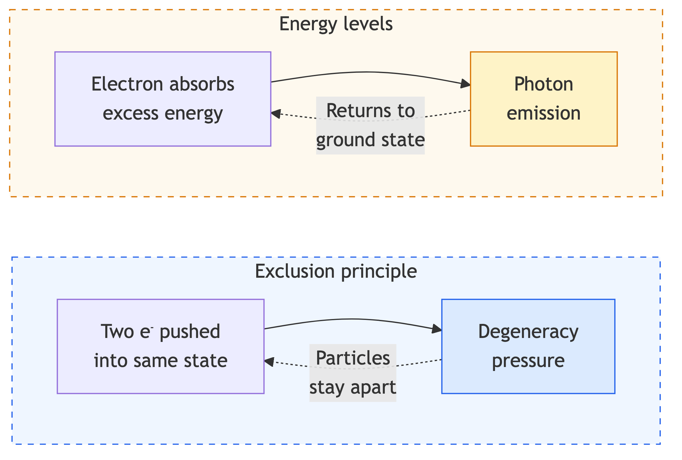 Suppose two electrons are pushed toward the same state with identical quantum numbers (Fig. 3). The moment an external force — say, the colossal pressure inside a dying star — tries to "squeeze" a particle into an already occupied state, the system instantly responds with a counterforce. The system's wave function "senses" the violation of a fundamental symmetry and generates what is known as degeneracy pressure. The outcome of the process is directed at compensating the disturbance (the attempt at compression), which prevents the collapse of atoms and allows solid matter to exist. The system corrects its state because any other behavior is forbidden by the geometry of space itself. And every electron obeys this principle.