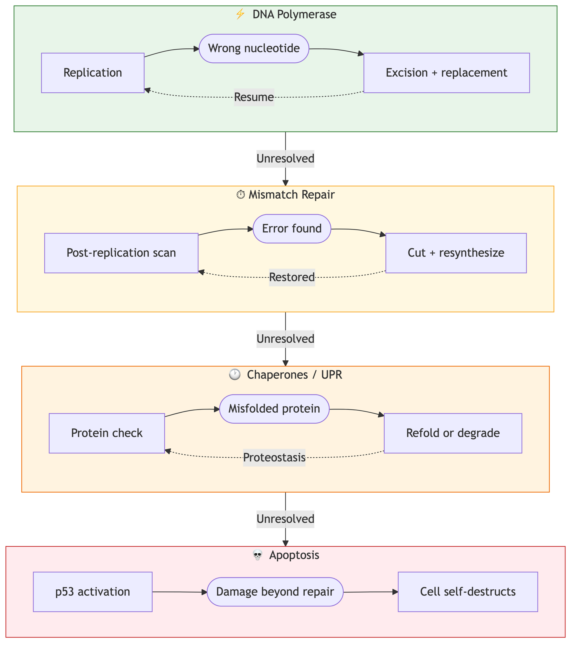 DNA polymerase, for example, works like a typewriter with a built-in eraser: if it places the wrong "letter," it physically cannot proceed until it "erases" the error and replaces the nucleotide with the correct one (Fig. 5). If this instant self-check fails, the next tier of quality control kicks in: specialized editor proteins re-examine the finished text. At the whole-cell level, chaperones attempt to refold misshapen proteins. Finally, in a critical situation where accumulated errors threaten the organism, the system makes a final reflective decision — triggering apoptosis (self-destruction) to prevent the buildup of chaos.