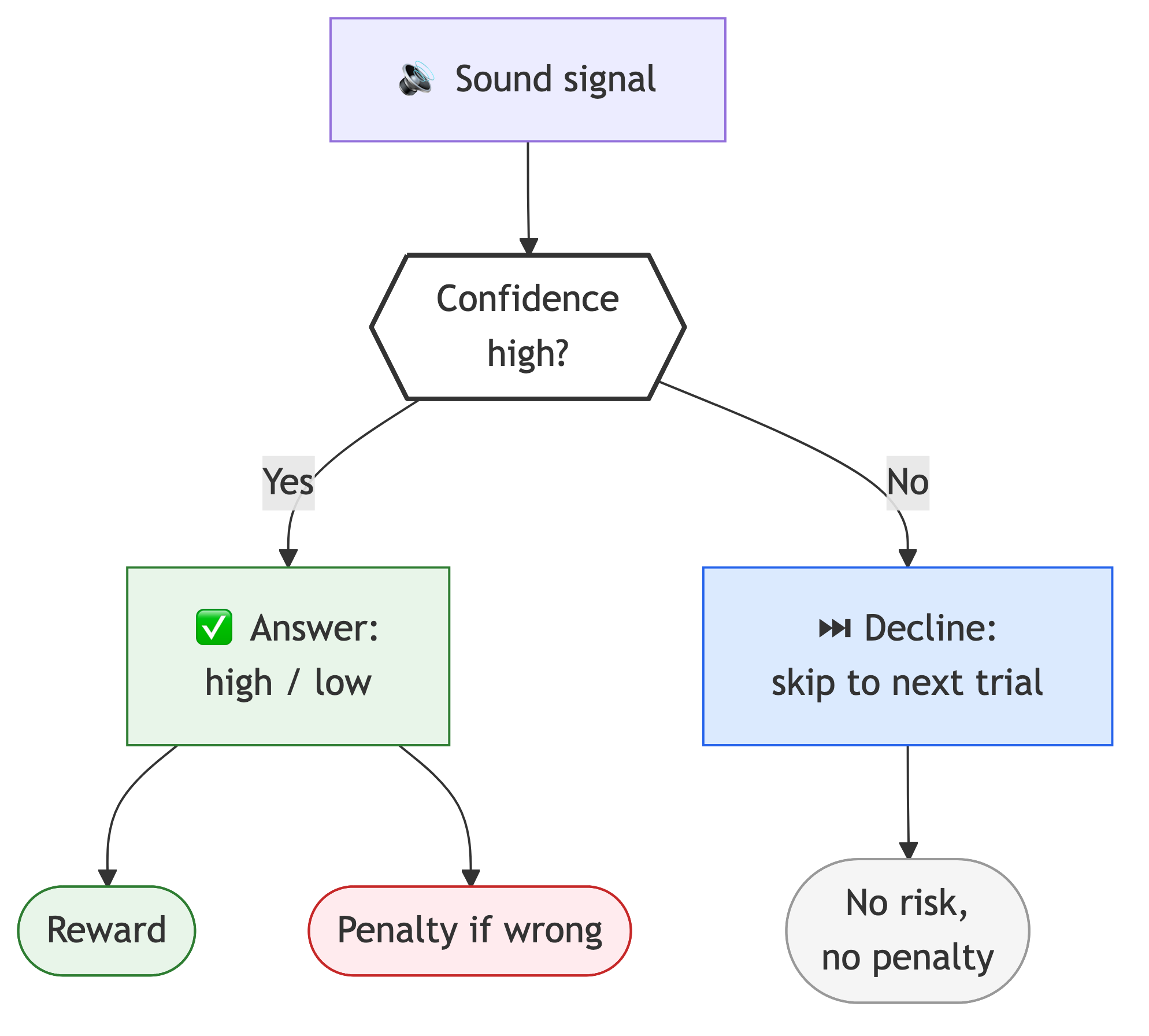 In experiments by J. David Smith (Smith et al., 1995) with bottlenose dolphins, the capacity of mammals to monitor their own uncertainty was demonstrated. A dolphin was asked to distinguish between sound tones of different frequencies (Fig. 6). For correctly identifying the higher-frequency source, the dolphin received a reward; for an error, a temporary penalty — a delay before the next trial. The researchers then introduced a third option: the ability to "decline" the trial. It turned out that when the frequency difference became critically small and the task was objectively difficult, the dolphin preferred to press the decline button, avoiding the penalty and moving to the next round. This is how the internal reflective loop works: the animal evaluates not just the external signal, but the reliability of its own brain's processing of that signal, choosing a strategy that minimizes risk.