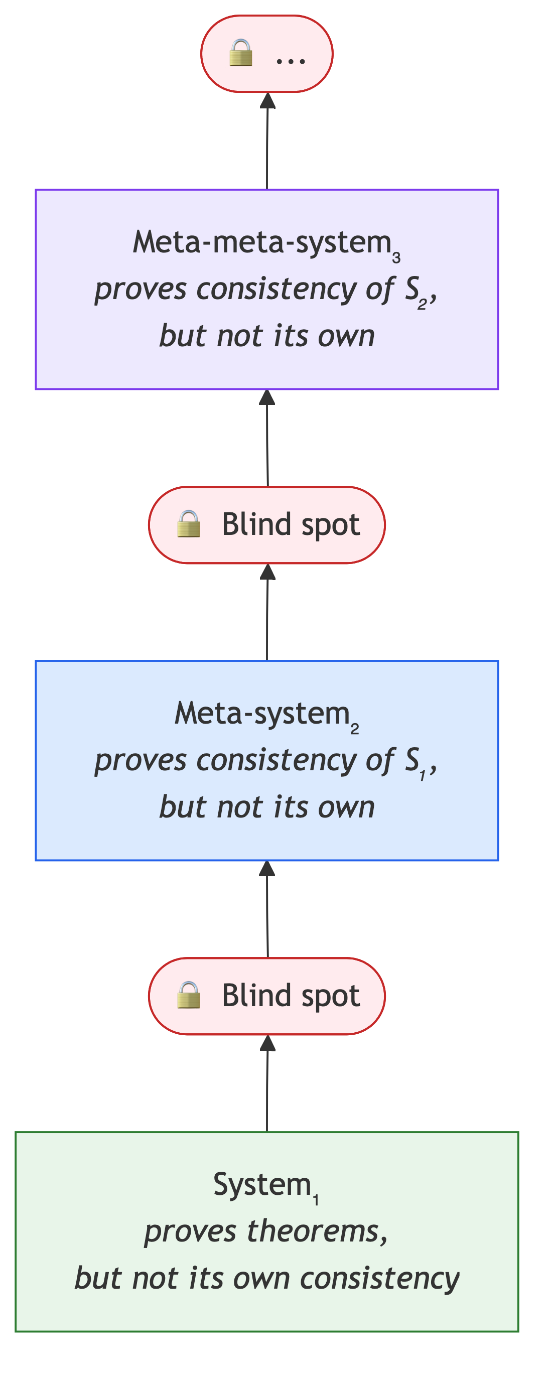 Gödel's two incompleteness theorems establish a hard epistemological limit for any complex system: complete self-knowledge from within is technically impossible. The first theorem states that in any sufficiently powerful formal system, there will always be true statements that cannot be proven by the system's own means — meaning "truth" is always broader than "provability," and the system will never contain the full totality of knowledge about itself. The second theorem is even more devastating, asserting that a system cannot prove its own consistency while remaining within its own rules. To verify the absence of internal errors and logical dead ends, the system must ascend to a meta-level and examine itself "from outside" — yet that external vantage point itself becomes a new system with the same blind spots (Fig. 9).